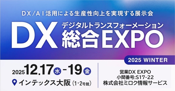 財務・会計システムおよび経営情報サービスを開発・販売する株式会社ミロク情報サービス(本社:東京都新宿区、代表取締役社長:是枝 周樹、以下「MJS」)は、2025年12月17日(水)~19日(金)の3日間、インテックス大阪で開催される「DX 総合EXPO 2025 冬 大阪」(以下、「DX 総合EXPO」)内の専門展「営業DX EXPO 2025 冬 大阪」(以下、「営業DX EXPO」)へ出展します。