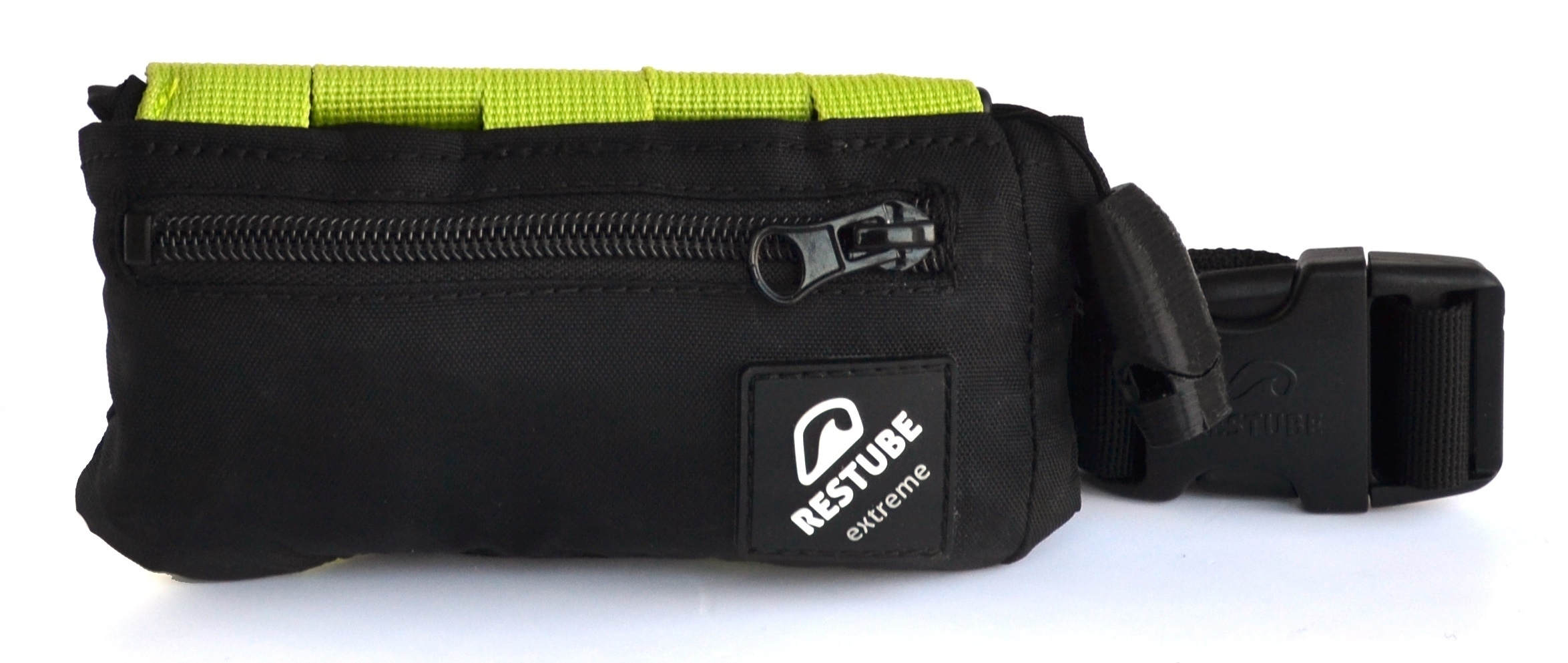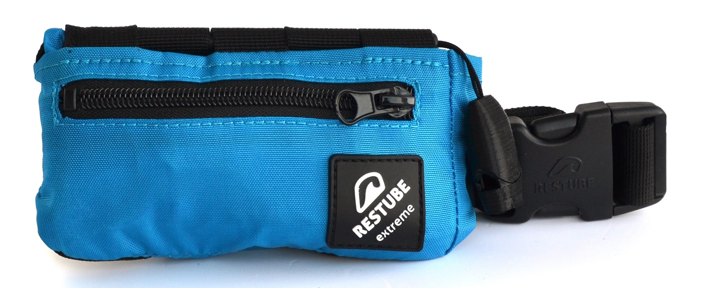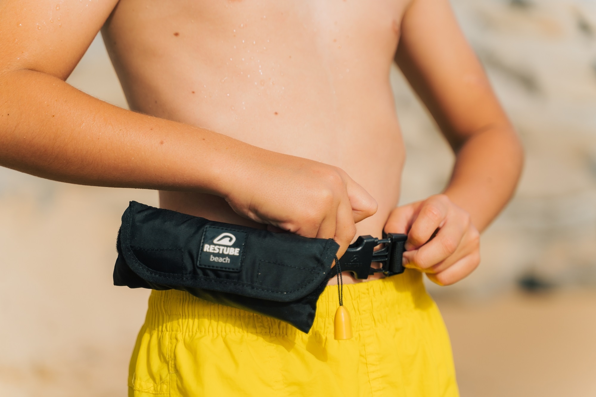 『レスチューブ・ビーチ KIDS』は、超小型・軽量の膨張式・緊急浮力体です。着用時は小型のポシェットで、重量はわずか190gです。もしもの時にトリガーコードを引くことで、瞬時にイエローの鮮やかな浮力体(ブイ)が目の前に現れます。抱きかかえ浮いていることができます。ブイの視認性が高いため、SOS発信装置として、外部に危機を伝え、浮いて救助を待つことができます。レスチューブ・ビーチ KIDSは10歳以上の泳げるお子様向けです。10歳未満のお子様には、必ずレスチューブを着用した大人が付いていてください。
