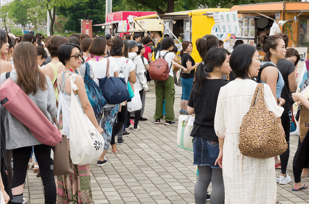 ホットドッグやカフェといったライトミールから、有機野菜を使った健康的なフード、カレーやお腹を満たすカレーやビビンバなどのキッチンカー。ヨガウェアや雑貨、健康に良い商材を含めたブランドなど30店舗以上が出展。