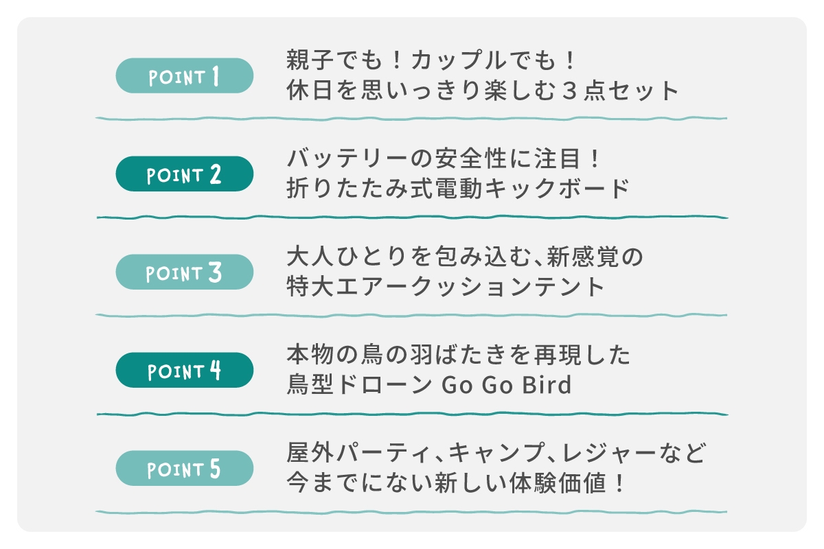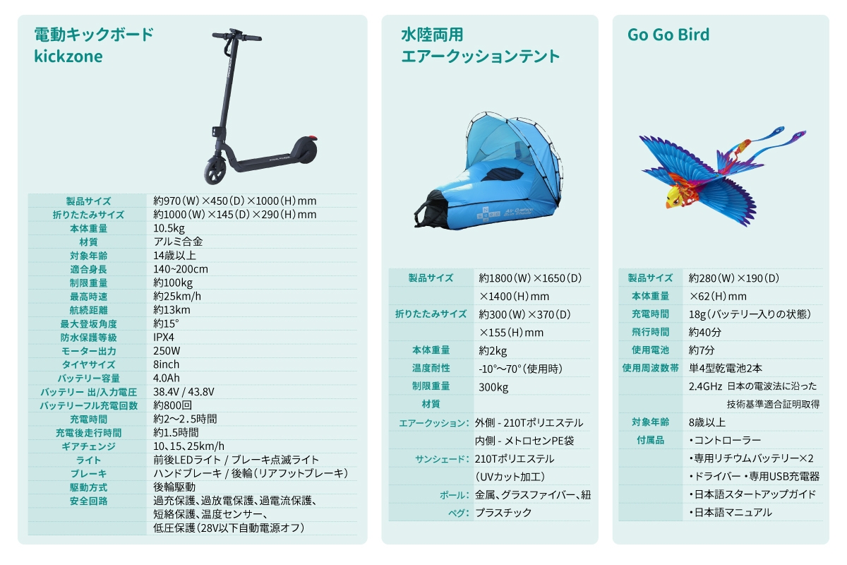 バッテリーの安全性を重視した電動キックボード、 ほっと一息くつろげる水陸両用エアークッションテント、 鳥の羽ばたきを再現した鳥型ドローンGo Go Birdがセットに