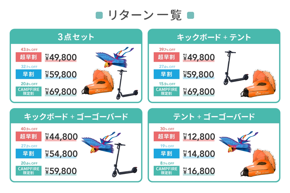 「バッテリーの安全性を重視した電動キックボード」、「ほっと一息くつろげる水陸両用エアークッションテント」や「鳥の羽ばたきを再現した鳥型ドローンGo Go Bird」をセットにして、プロジェクトを開始!キャンプや公園、屋外パーティなどレジャーやアウトドアを家族でより楽しめる最適なファミリーレジャー製品です!