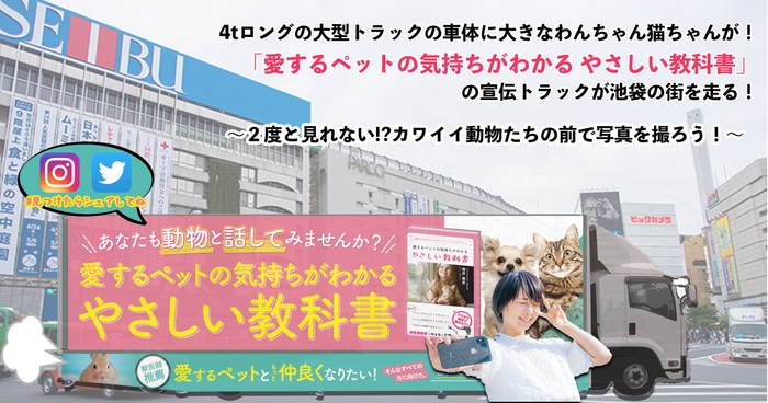 4tロングの大型トラックの車体に大きなわんちゃん猫ちゃんが! 「愛するペットの気持ちがわかる やさしい教科書」 の宣伝トラックが池袋の街を走る!