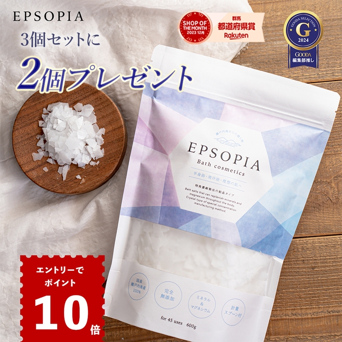 対象商品:\3個セットに2個プレゼント/ 4月限定! エントリーでポイント10倍! バスソルト 入浴剤 1袋 45回分 600g 追い焚きできる マグネシウム 塩化マグネシウム 塩 天然 塩 風呂 発汗 浄化 無添加 肌 子供 セット ギフト プレゼント 送料無料 EPSOPIA エプソピア