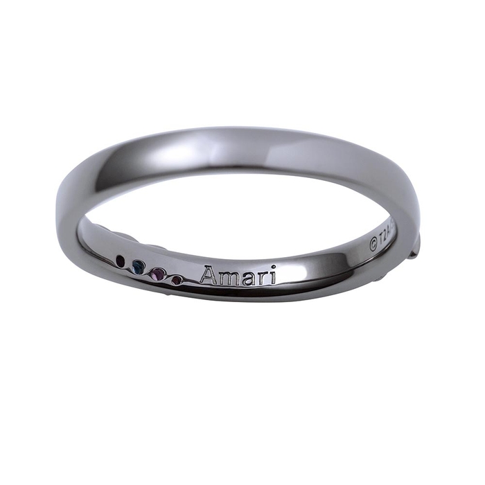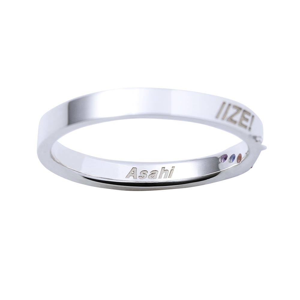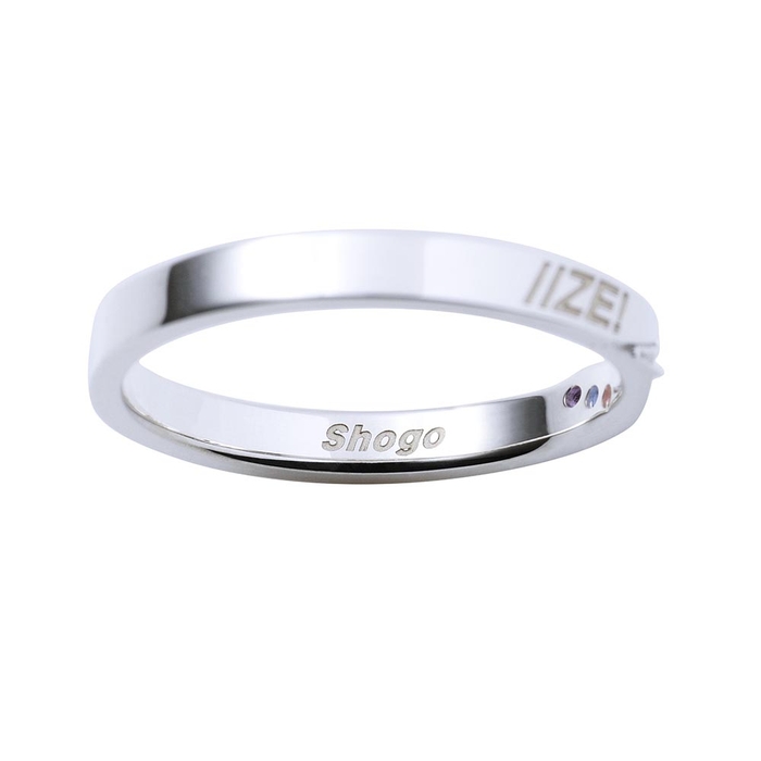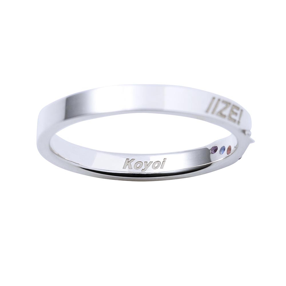男子アイドルユニット「WITH」のカラーストーン3石をセットした平打ちフォルムの側面には、「IIZE!」をさりげなく刻印。内側には名前刻印を施しました。