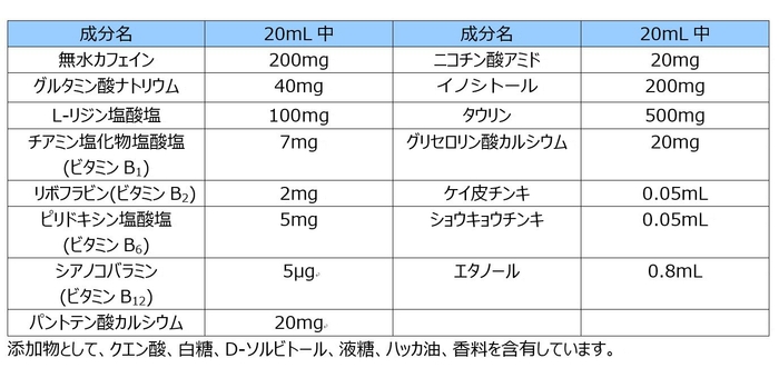 規格成分 1本(50mL)当たり:カフェイン 200mg、L-アルギニン 200mg