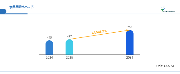 LP Informationが発表した新たな市場調査レポート「世界食品用吸水パッド市場の成長予測2025~2031」によると、世界の食品用吸水パッド市場規模は2024年の約445百万米ドルから2025年の477百万米ドルへと順調に拡大すると見込まれ、予測期間中は年平均成長率(CAGR)8.2%で成長し、2031年には763百万米ドルに達すると予測されている。