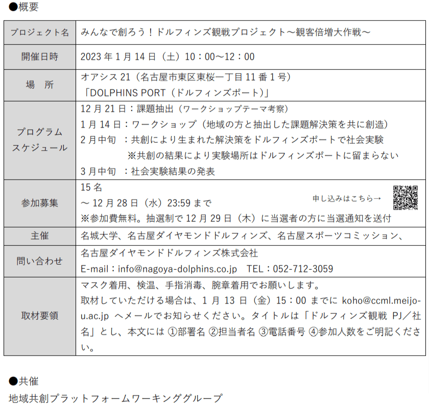 今回は名古屋スポーツコミッションのスポーツ産業拡大に資するためコロナ禍で減退したプロスポーツクラブの集客拡大を目的に、利用者を含めた地域の方々と新しい価値を協働創造する共創ワークショップを実施。共創により生まれた解決策をドルフィンズポートで社会実験し、効果を検証します。