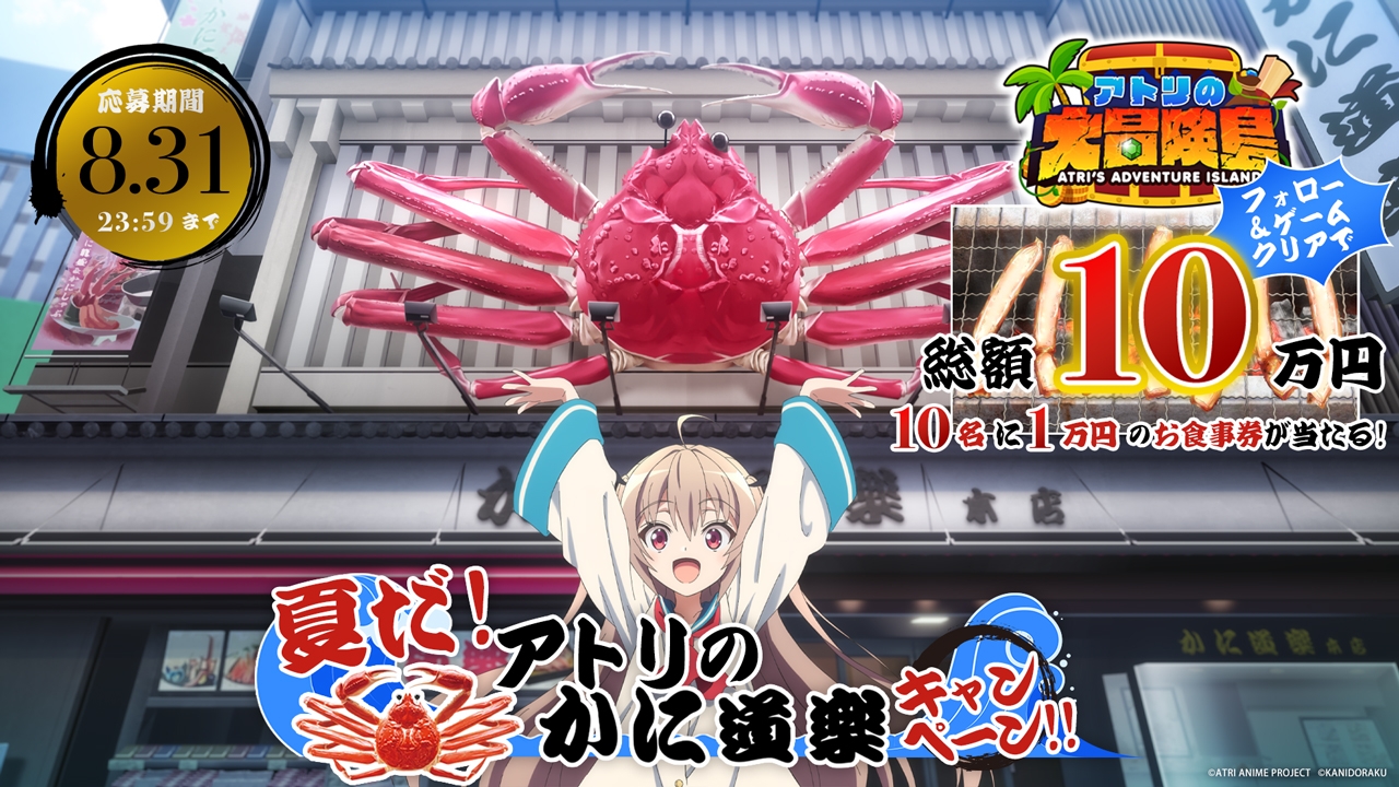 さらに、今回エンドカード公開を記念して「夏だ!アトリのかに道楽キャンペーン」も開催決定!アニメ公式Xをフォローし、公式HPで展開中の横スクロールアクションゲーム「アトリの大冒険島」をクリアした方に、「かに道楽」各店舗で使用可能なお食事券、総額10万円が10名様に当たります。応募は本日から8月31日までにて、ぜひこの機会に店舗へも訪れてみてください。