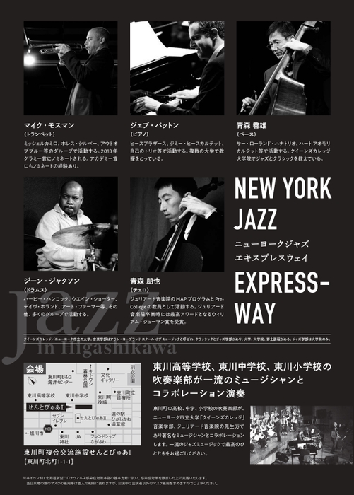 本イベントは、東川町にゆかりのあるニューヨーク在住の青森善雄氏と、所属ジャズグループであるNew York Jazz Expresswayの他メンバー4名を招聘。その5名と、東川町の高校、中学、小学校の吹奏楽部とコラボレーションをし、演奏を行うコンサートです。