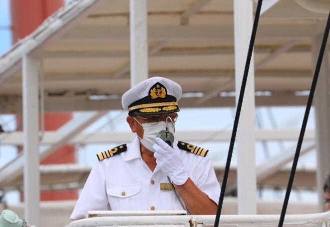船出を祝い船長からお祝いの言葉が贈られます。応援旗で船旅の始まりも盛り上げます。