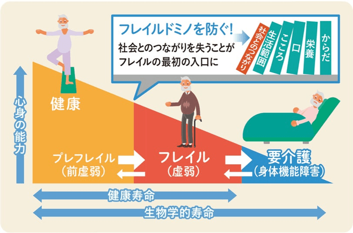 「フレイル」という言葉をご存じですか?「フレイル」は、年を取って心身の活力(筋力、認知能力、社会とのつながり)が 低下した状態をいい、2014年に日本老年医学会が命名しました。英語の「Frailty(虚弱)」という言葉に由来しています。どんな人も老化は避けては通れません。要介護の一歩手前の状態であるフレイルは、その兆候に気付き、日常生活を多方面に見直し、適切な予防対策を取れば、進行を緩やかにしたり、心身機能の低下を防いだりすることができます。