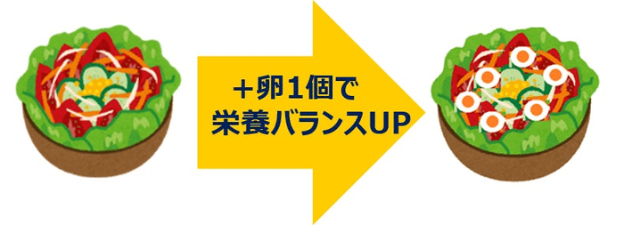 フレイル予防の柱は、「栄養」「運動」「社会参加」です。柱の1つ「栄養」では、1日3食バランスよく食べることが全世代を通して大切です。そしてフレイル予防には、タンパク質の摂取が特に重要といわれています。そこで、おすすめの食材に“卵”があります。卵は良質なタンパク源で、人間にとって必要な栄養素がほとんど含まれています。不足しがちなタンパク質が補えるうえに、ほかの栄養素も一緒に体に取り入れられるうれしい食材といえます。しかし、卵にはビタミンCと食物繊維が含まれていません。そこで、ビタミンC、食物繊維、カリウムなどを含む野菜と卵を一緒に食べると、より理想の栄養バランスに近づきます。