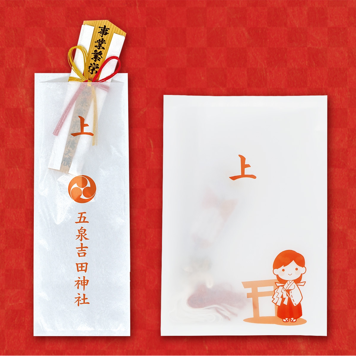 一般的な授与品袋は白い上質紙でできており、中身は見えません。授与品を収める袋としての機能はこれで十分ですが、「透けてる授与品袋」は「中身が見える」ことで数多ある授与品を袋に入れたままでも、中にどんな授与品が収められているかひと目でわかり、授与所に並べた際の識別性向上に役立ちます。また、ありがたい授与品が袋の上からでも透けて見える様子は大変見栄えが良く、参詣者の興味関心・感謝の心を喚起します。