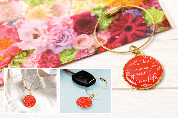 バッグ、家や車のキーなどにつけてお楽しみいただけるキーリングには、「All the best wishes for your future life(しあわせあふれる毎日でありますように)」のメッセージがデザインされています。