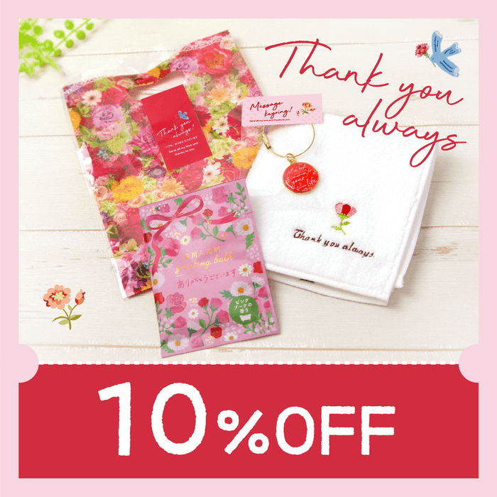 母の日らしいお花のビニールバッグ入りで、そのまま渡すことができます。“いつもありがとうございます”のシールで贈り主の気持ちが伝わります。