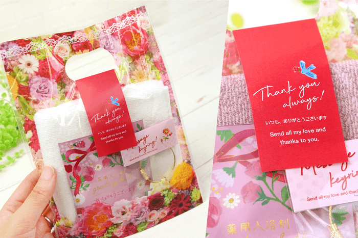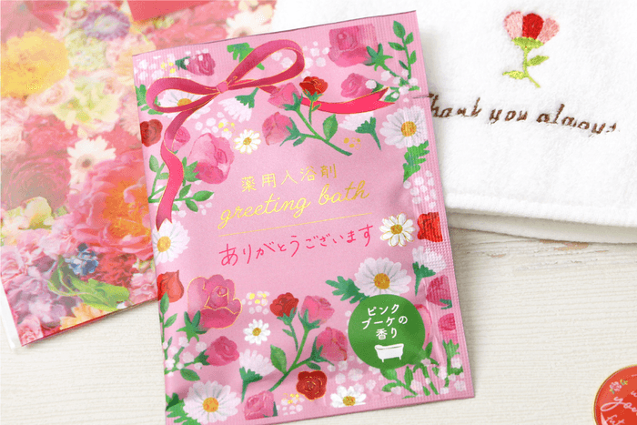 “ありがとうございます”の文字がさりげなく入っている薬用入浴剤は、華やかなお花の香り。癒やしの時間をお届けします。