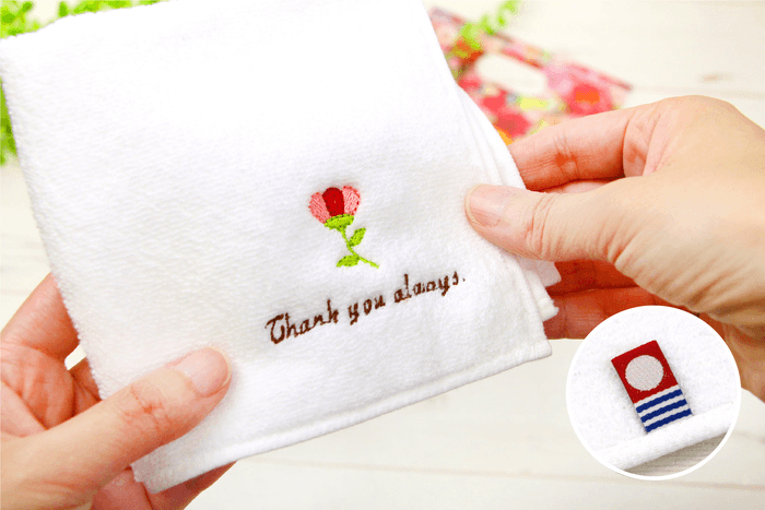 ほどよく厚みのある今治タオルハンカチに、かわいいお花と“Thank you always.(いつもありがとう)”の刺繍をあしらいました。色は、落ち着きのあるサーモンピンクと清潔感のあるホワイトからお選びいただけます。
