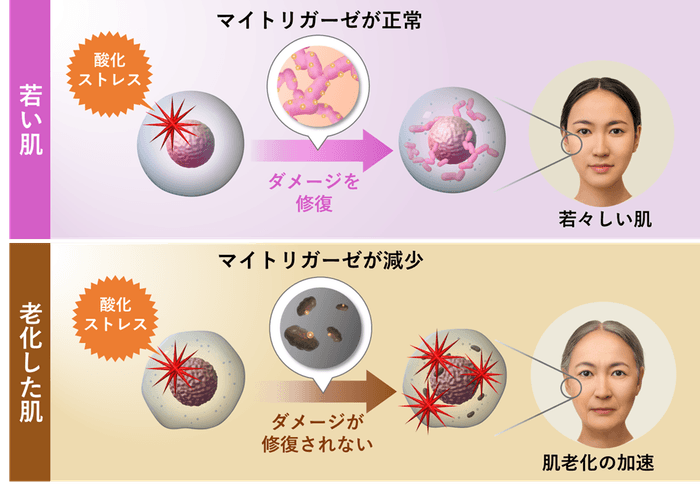 肌が受けたDNAダメージを自ら修復する力は、マイトリガーゼの減少で阻害