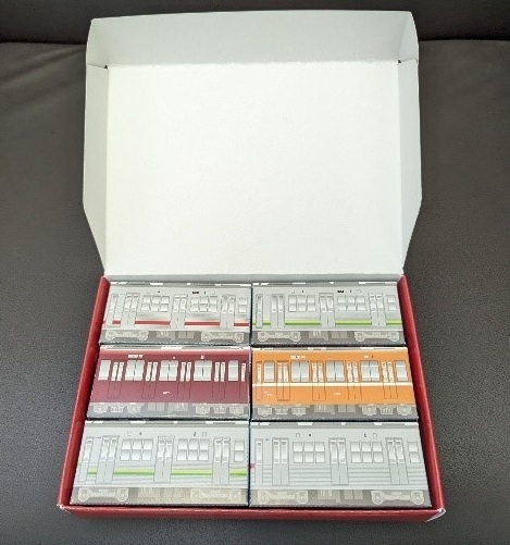 車両をデザインした小箱に個別包装されたショコラケーキが6種類セットで化粧箱に入っています。小箱のデザインは旧近鉄車両(マルーン、ラビットカー)、旧東急車両(赤歌舞伎、緑歌舞伎、赤帯、緑帯)の6種類です。