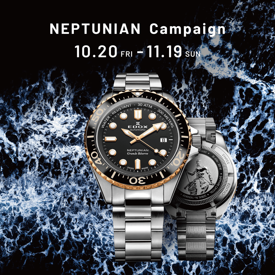 株式会社ジーエムインターナショナルが日本総代理店を務めるスイス高級時計ブランド EDOX(エドックス)が、10月20日(金)より「ネプチュニアン キャンペーン」を開催いたします。期間中に対象コレクションをご購入いただいたお客様に、アメリカのステンレスボトルブランド Hydro Flaskとのコラボタンブラーをプレゼントいたします。また、本キャンペーン開催と同時に、新作『ネプチュニアン』を発売いたします。