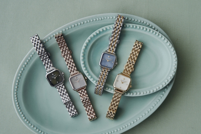 アンティークの宝物や90年代のミニマリズムからインスピレーションを得て誕生した「GROSVENOR MINI」は、繊細で洗練されたスクエアダイヤル(20mm)が特徴。サンレイ仕上げの文字盤には、セージグリーン、チョークブルー、アールグレイ、アイボリーといったニュートラルなカラーバリエーションを揃えました。輝くクリスタルマーカーとミニマルなケースが控えめなエレガンスを演出し、ブレスレットタイプのストラップはまるでジュエリーのような存在感を放ちます。