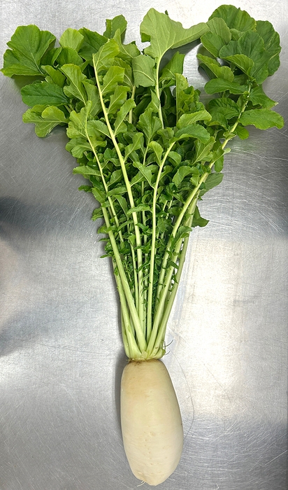 田辺大根は、江戸時代から現在の東住吉区田辺を中心に栽培されていた大根です。大正から昭和にかけて農地が減少したことにより幻の野菜となっていましたが、近年、種子が発見され、地域の人たちの協力によって「なにわの伝統野菜」として復活しました。白首で根部分は標準で長さ 20cm あまり、筒状のハムのような形でやや下膨れ、先端にシッポのような根がのびます。葉は根部分の 2 倍以上に育ち、苦味もなく美味しく食べられます。肉質は緻密で生で食べると辛みの中にほのかな甘みが感じられ、煮炊きしても煮崩れにくく辛みが甘みに変わります。漬物などにしても歯ごたえがあり、大根のうま味が感じられます。食べごろは 11 月上旬から 1 月下旬。