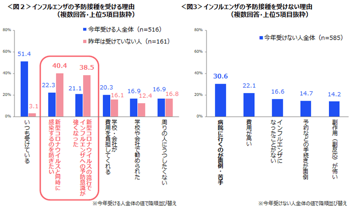 予防接種を受ける理由は「いつも受けているから」が最も多く挙げられたが、昨年予防接種を受けていなかった人では、今年の新型コロナウイルス流行の影響から予防接種を受けると多くが回答。