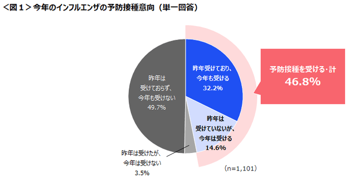 今年のインフルエンザの予防接種意向を聴取したところ、受ける人が46.8%。