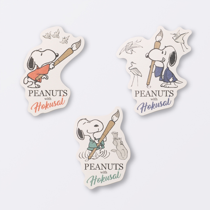 PEANUTSコミック誕生75周年を迎える今年、日本の漫画の原点ともいえる北斎の代表作の一つ『北斎漫画』とスヌーピーの記念コラボレーションを実施。「PEANUTS with Hokusai」と称して『北斎漫画』と『PEANUTS』の限定アートを開発しました。羽織りを身に着け、筆を持って描く姿のスヌーピーや、北斎漫画に登場する動物・人物たちとの貴重なコラボレーションがデザインされた、この時期だけの特別なオリジナルグッズを発売します。