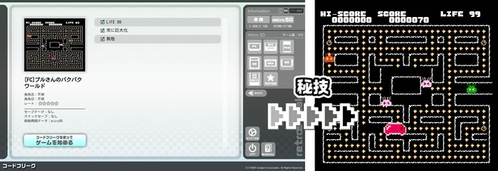 コードフリークとは、ゲーム内のお金やレベルなどのパラメーターをMAXにしたり、アイテムを変更したり、自分のキャラクターを無敵にしたりできる便利な機能です。レトロフリークでは、対応する全ての機種でコードフリーク機能を使うことができます。コードフリーク機能には、各ゲームごとに「秘技コード」と呼ばれるパスワードのような数字が必要となり、レトロフリーク総合サポートページではmicroSDカード(別売)に入れるだけで使える約1000タイトル分の秘技コードを無料配信中です。