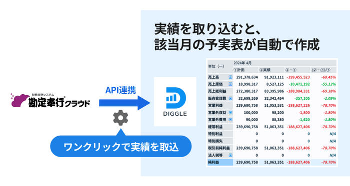 それにともないコラボラティブ経営管理サービス「DIGGLE」と、累計導入数80万(※1)の奉行シリーズの財務会計システム「勘定奉行クラウド」とのAPI連携機能を追加しました。「勘定奉行クラウド」ユーザーの、よりシームレスな経営分析を実現します。