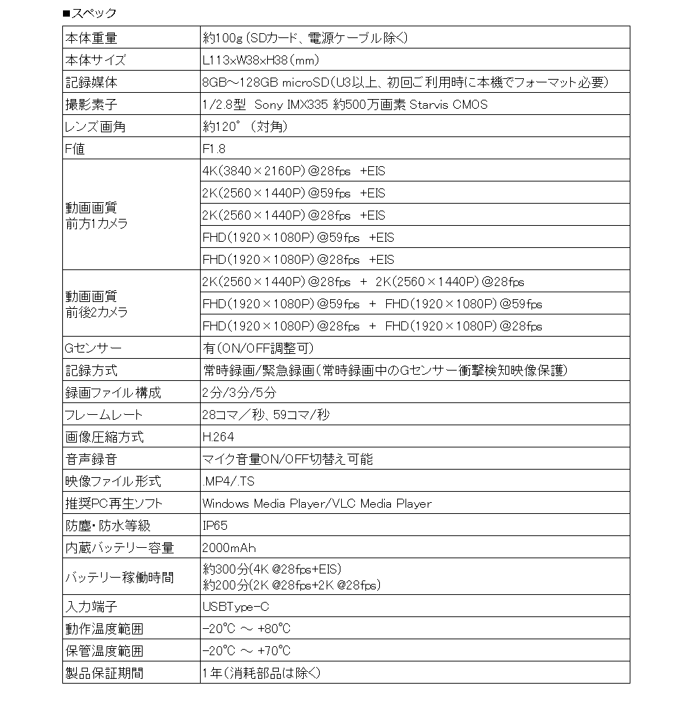 動画画質 前方1カメラ:4K(3840×2160P)@28fps+EIS
