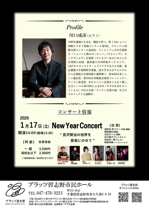 フィレンツェ五月音楽祭をはじめとした世界の音楽祭に出演する、日本の誇れるピアノ奏者川口成彦のリサイタルがプラッツ習志野にて開催!
