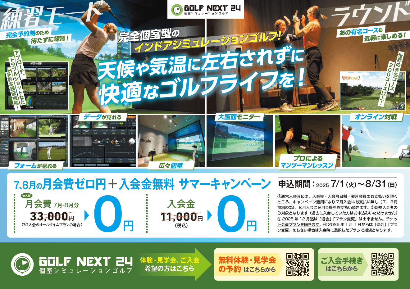 完全個室型シミュレーションゴルフ「GOLF NEXT 24(ゴルフネクスト24)」を運営するワイムシェアリング株式会社(本社:東京都新宿区、代表取締役社長:佐藤 直史)は、猛暑シーズンの健康被害を懸念し、より多くのゴルファーの方々に快適にゴルフを楽しむ環境を提供するため、7・8月を無料でご利用いただけるサマーキャンペーンを開催いたします。※新規入会者が対象となります。