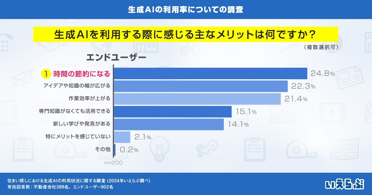 エンドユーザー(※)についても、不動産会社と同様に「時間の節約になる」(24.8%)が最も多い回答となっていますが、次に多い回答は「アイデアや知識の幅が広がる」(22.3%)になっており、生成AIの利用目的によって感じられるメリットが異なることが分かります。