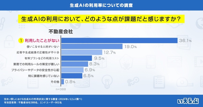 また生成AIの利用課題については、19.0%の不動産会社が「使いこなせる人材がいない」と回答しており、「利用したことがない」不動産会社にとって課題となっています。