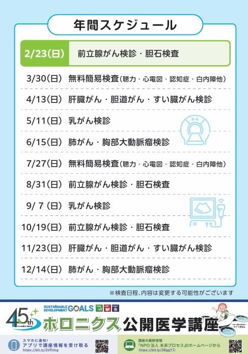 がんや心臓病・脳卒中といった生活習慣病の早期発見と治療へ繋がる第一歩である「検診」の重要性を広く周知し、啓発活動を推進いたします。一人でも多くの方に受診いただけるよう、1年を通したスケジュールで週末検診イベントを予定しています。