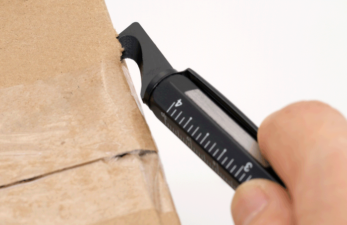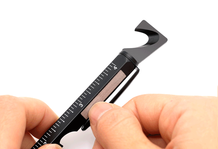 オールブラックのボディの側面には、最長10cm、1/100mm目盛りまで測れる定規がデザインされています。