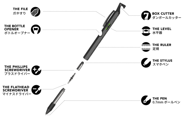 カッター、ドライバー、定規など、日常生活でよく使う9つの道具を1本にまとめた多機能ツールペン