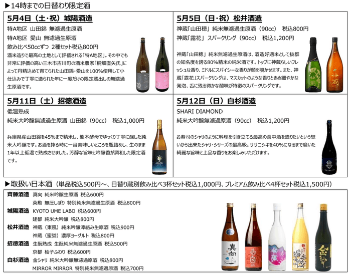 京都の人気5蔵元の日本酒・リキュール(計13銘柄)が楽しめる特設ブースが登場! さらに、京都の4蔵元が日替わりで登場し、希少な限定酒を14時まで提供いたします。
