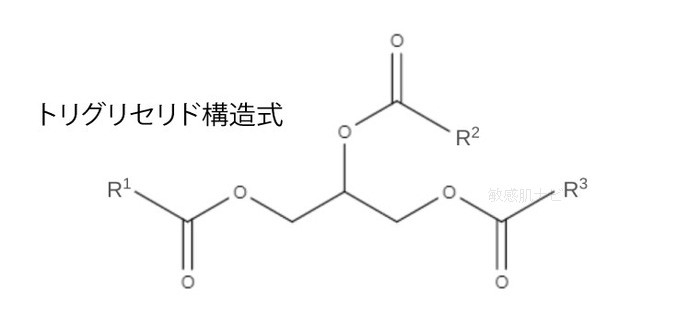 植物油の主成分や皮脂の構成成分の1つで、グリセリンに脂肪酸が3つ結合した構造ものです。