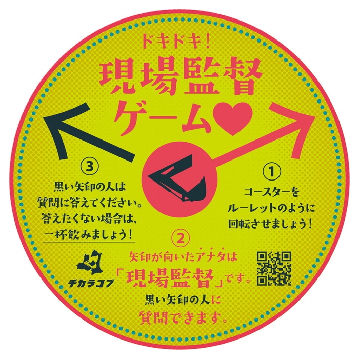 裏面を上にしてルーレットのように回転させ、赤い矢印が向いた人が「現場監督」。黒い矢印の人に質問できます。黒い矢印の人は、質問に答えたくない場合は、一杯飲みましょう!