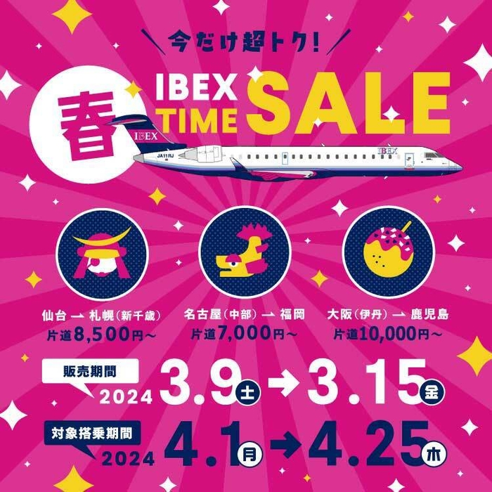 アイベックスエアラインズ株式会社(以下IBEX)は、3月9日(土)より4月出発分のTIME SALEを実施いたします。