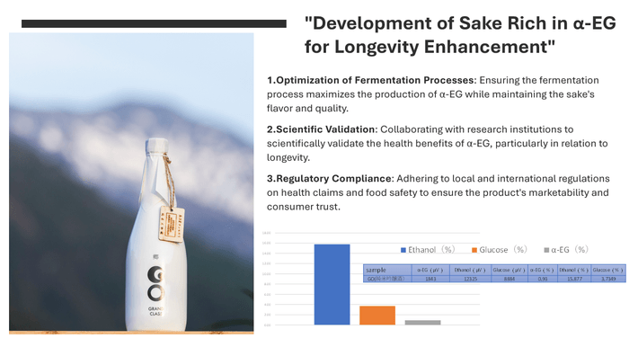 機能性物質として知られてるα-EGは日本酒のグルコース、エタノールに次ぐ、第3主要成分であることが知られていて、純米酒で0.6~0.8%または吟醸酒で0.2~0.3%含まれることが一般的とされています※1。 この度、津南醸造が行うスマート醸造※2の仕組みを用いて日本酒の高付加価値化を検討する中で、コシヒカリ由来の日本酒を作るプロセスにおいてα-EGを高含有化が期待されたことから、尾関健二先生のもとでα-EG量の計測をするに至りました。