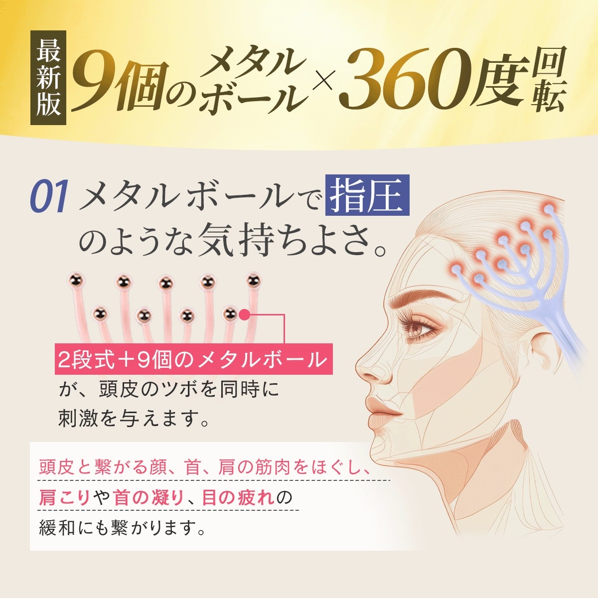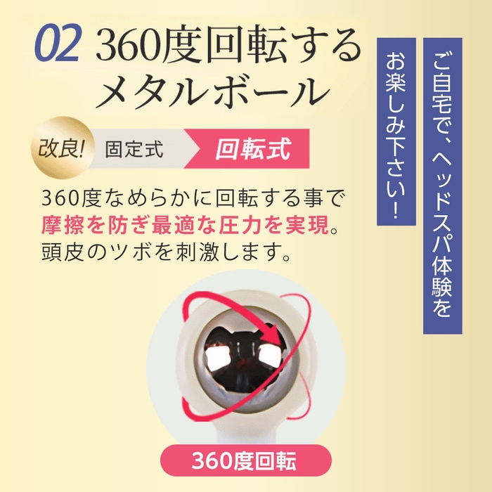 9個のメタルボールが2段式に配置され、頭皮全体を包み込むように刺激。