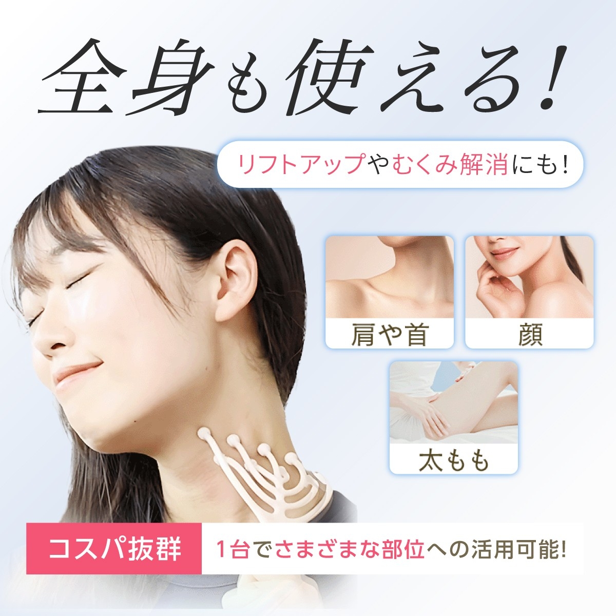 デスクワークでの肩こりや眼精疲労の緩和、血行促進によるリフトアップ、むくみ解消など、1本で全身の美容ケアをサポートします。