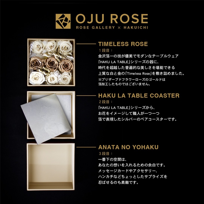 ローズギャラリー、箔一ともに1975年創業。ローズギャラリーは創業50周年を迎え、「伝統と革新」をテーマに更なる進化を目指しております。箔一とのコラボレーションは薔薇という植物と、箔一の伝統の美のコラボレーションマリアージュです。今回の商品「OJU ROSE」に込められたストーリーにプラスワン、お客様によりそれぞれ異なるシーンでご利用いただく、パーソナルストーリーをお重に加えていただく唯一無二の「OJU ROSE」。