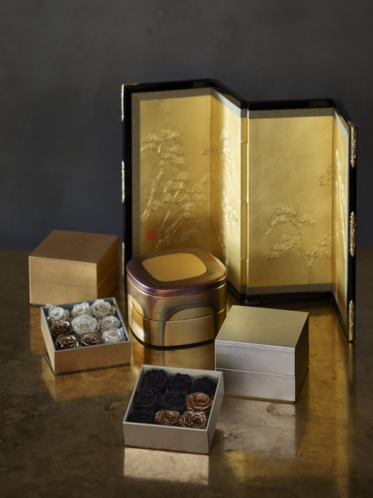 金箔の静かな輝きと薔薇の永遠の美を三段に重ねたギフト『OJU ROSE(お重ローズ)』が誕生します。