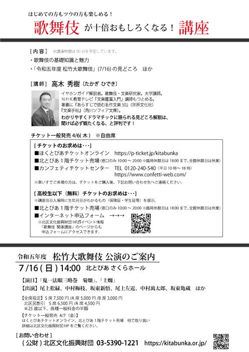 (公財)北区文化振興財団主催、『歌舞伎が十倍おもしろくなる!講座』が2023年6月25日 (日)に北とぴあつつじホール(東京都北区王子1-11-1)にて開催されます。チケットはカンフェティ(運営:ロングランプランニング株式会社、東京都新宿区、代表取締役:榑松 大剛)にて発売中です。