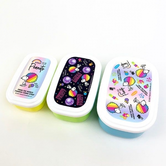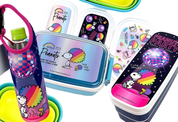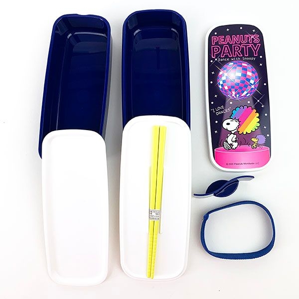 まず最初は、二段のランチボックスです。ミラーボールの下でステップを踏むアフロヘアのスヌーピーとウッドストックに、思わずニッコリ。カラフルで楽しくなるデザインが魅力的。
